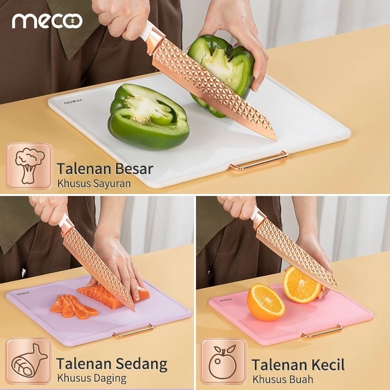 talenan Mecoo mengadopsi tiga ukuran berbeda untuk memudahkan pengguna mendiferensiasi talenan khusus sayuran, buah dan daging. Membantu mengembangkan kebiasaan baik memisahkan bahan olahan.