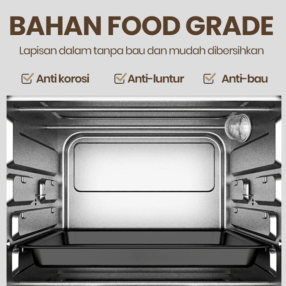 Dilengkapi dengan permukaan anti-lengket pada loyang, memudahkan proses pembersihan setelah digunakan.
