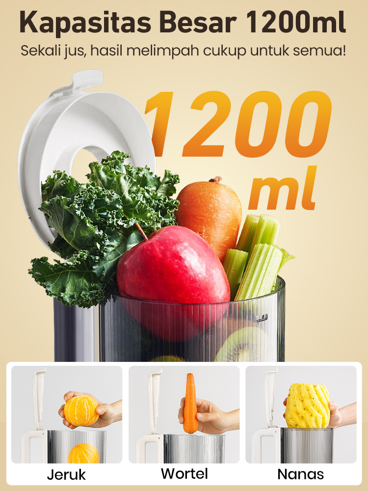 Bukaan corong kini lebih lebar (120mm) dan kapasitas tabung mencapai 1200ml! Bahkan nanas utuh bisa langsung masuk tanpa dipotong, benar-benar praktis, mengurangi oksidasi, dan proses juicing jadi lebih lancar.