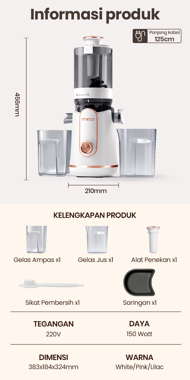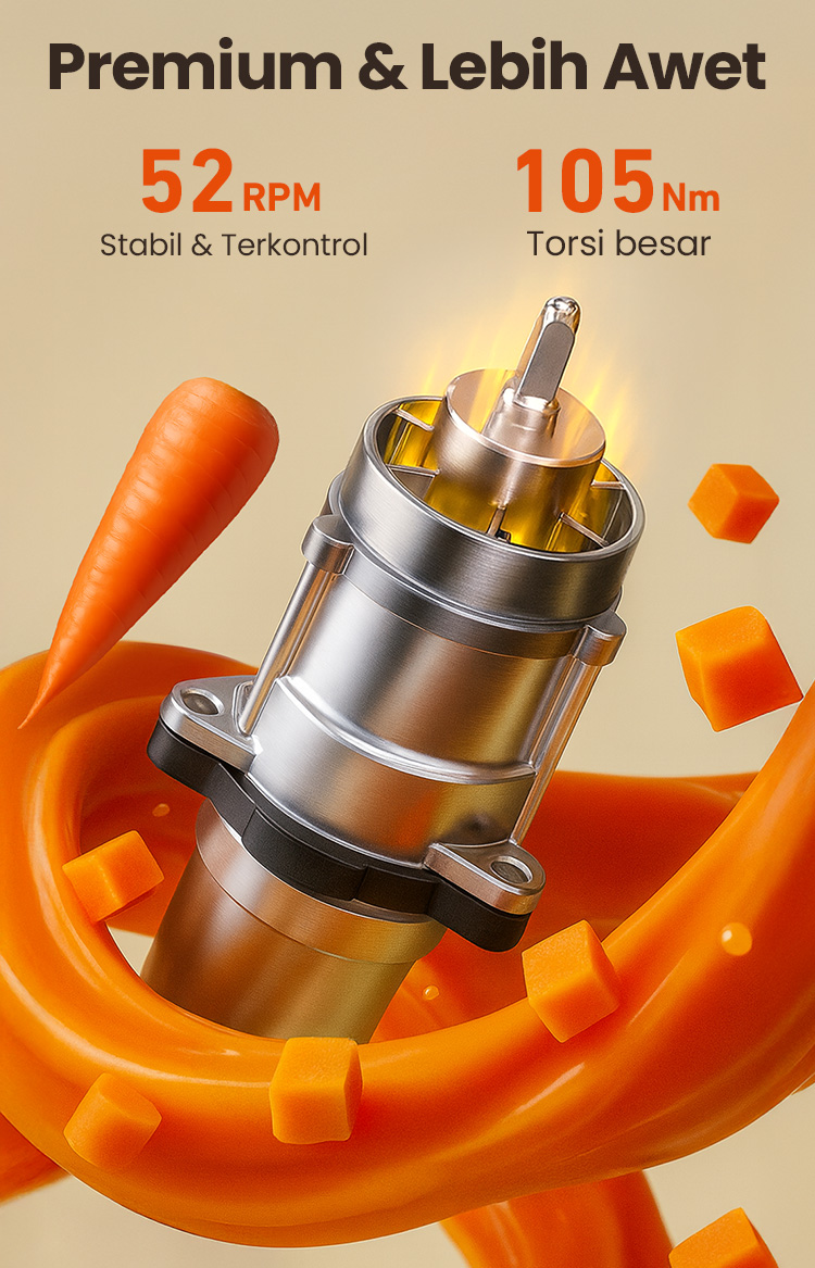 Teknologi motor mengurangi kebisingan, membuatnya hampir seperti berbisik. Bisa dibuat jus kapan saja — pagi atau tengah malam — tanpa khawatir mengganggu.