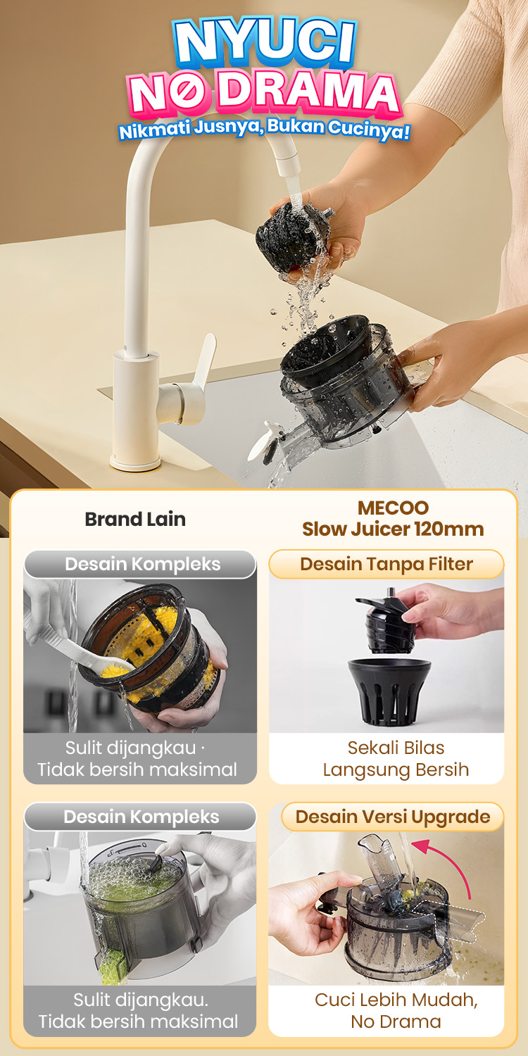 Struktur lubang ampas telah ditingkatkan, dirancang agar lebih mudah dibilas dan anti-penyumbatan. Tanpa filter rumit, cukup lepas dan bilas di air mengalir — bersih dalam sekejap!